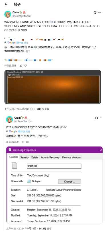 据介绍,《对马岛之魂》PC版本的安装大小约为75GB。但该玩家在正常游玩后发现硬盘突然告急,经检查后找到一份体积达280GB的文本文件。UFD Tech指出,该文件为游戏生成的崩溃日志(Crash File),尽管玩家表示游戏运行过程完全流畅,并未出现任何异常。