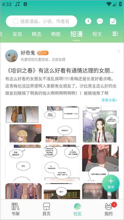 1、打开漫画软件在社区界面点击右下角的“+”号。