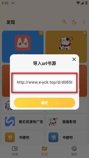 7、贴入书源地址http://www.e-yck.top/d/d0856f290a8765a6f08df6ac3ee42fbf,点击“确定”。