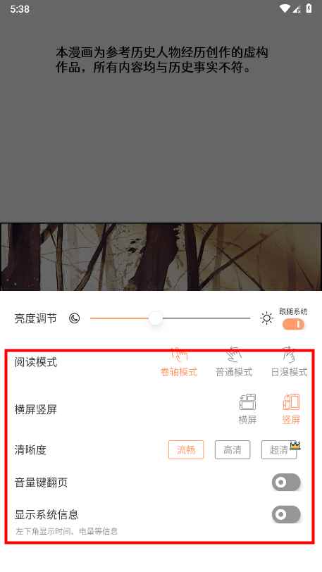 5、点设置,可以看到支持亮度调节、阅读模式切换、横屏竖屏、清晰度、音量键翻页、显示系统信息等设置。